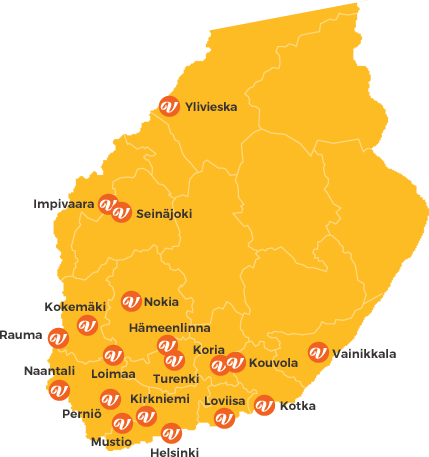 Helsinki Hämeenlinna ImpivaaraKokemäki KirkniemiKoria Kouvola Loimaa Loviisa Mustio Naantali Nokia Perniö Rauma Seinäjoki Turenki Vainikkala Ylivieska